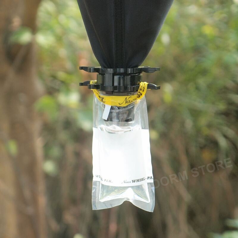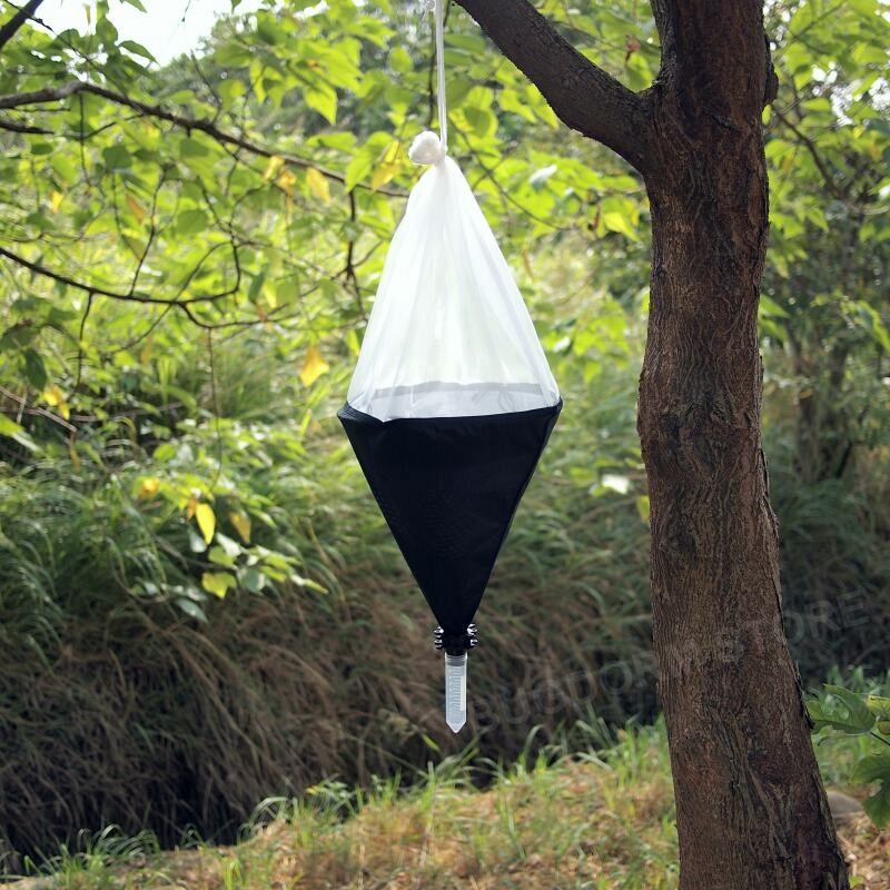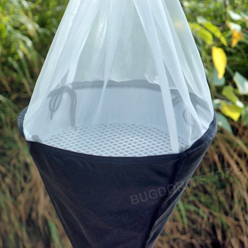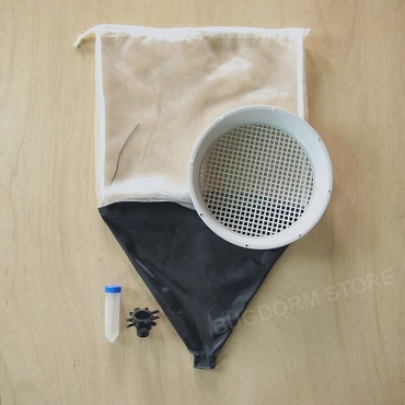 The tray is made of grey plastic and cut into a grille (7 mm sieve opening) to hold soil samples. The bottom funnel is black, smooth nylon cloth. The Eppendorf tube connector is PE plastic and connects the funnel to a collecting tube. Each tray-type Berlese funnel comes with one Eppendorf tube (50 ml) for collection containers. When the expected extraction amount is large, other containers (e.g., Whirl-Pak® sampling bag, NOT sold at the BugDorm Store) may be tied onto the connector.