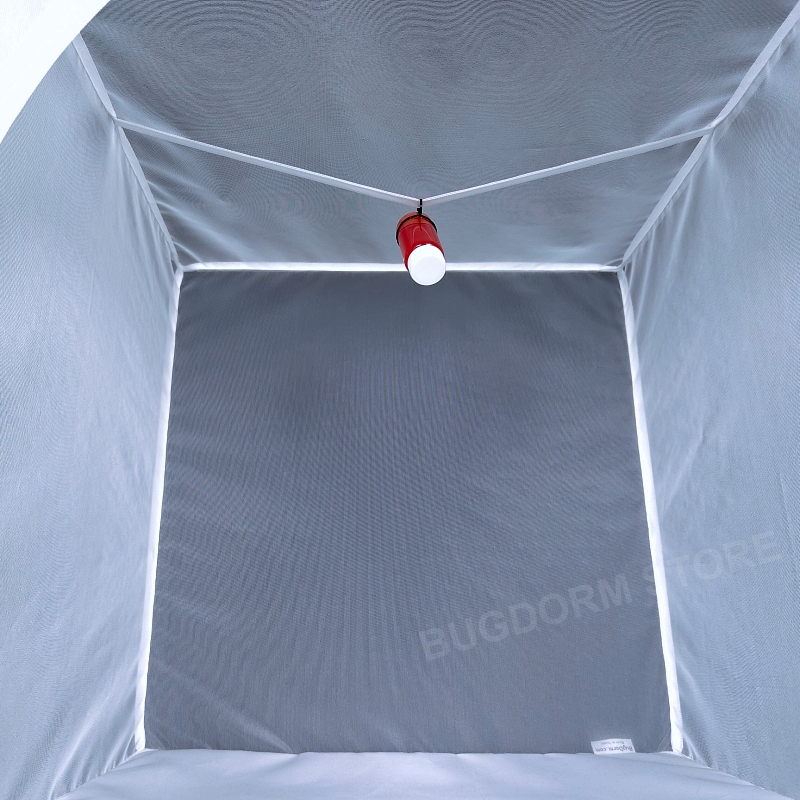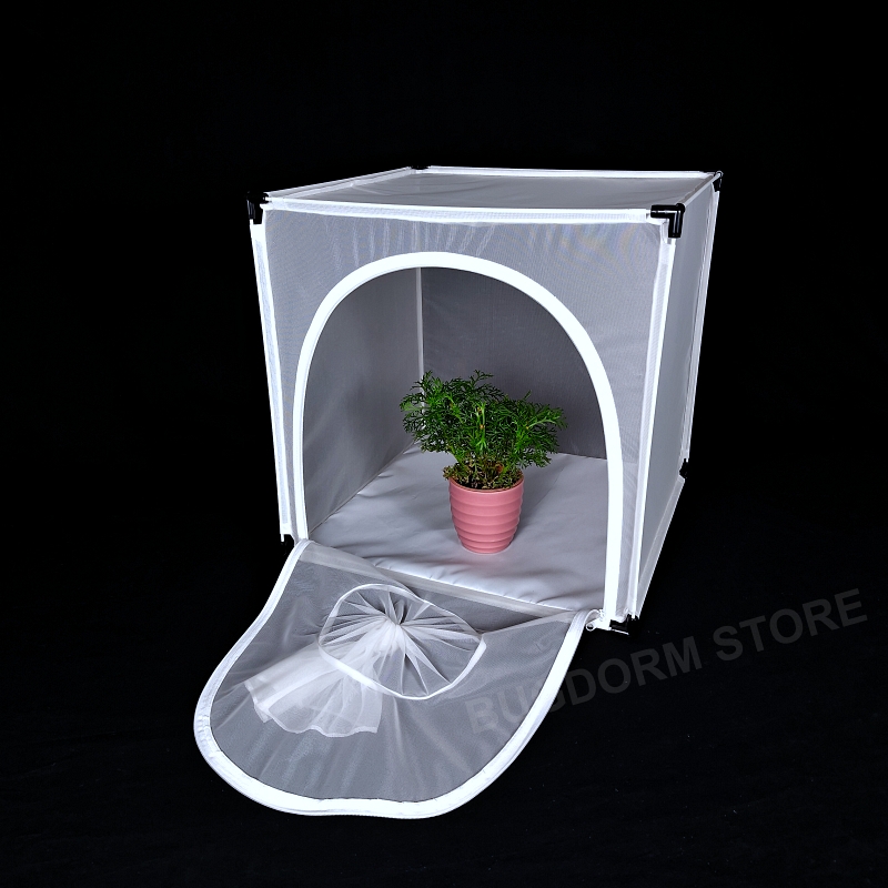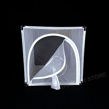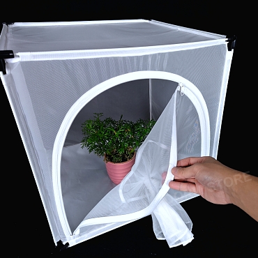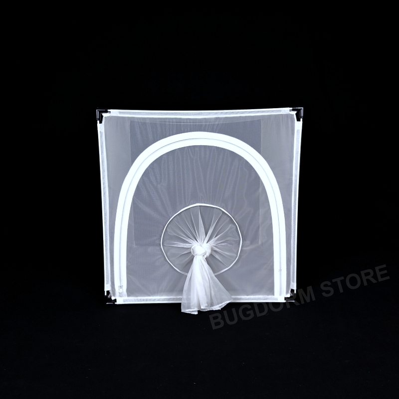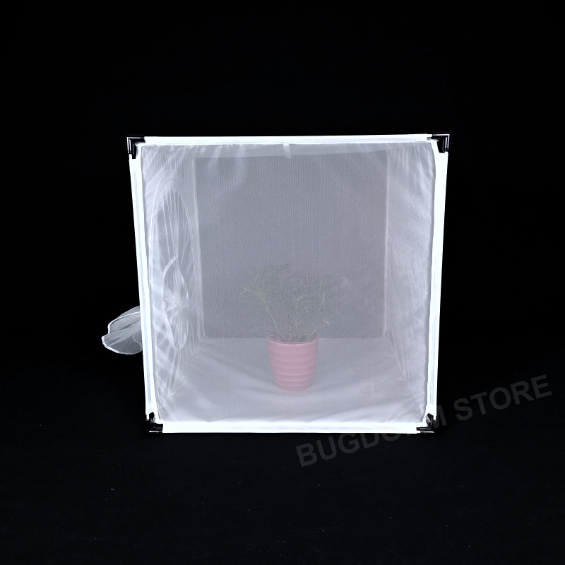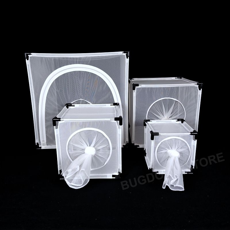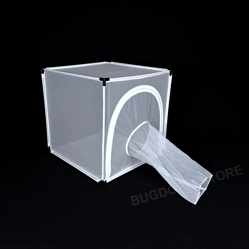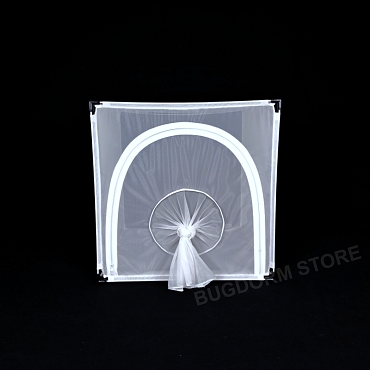 BugDorm-4E4545 insect cage is easy to assemble by simply connecting poles with connectors.  The BugDorm-4E4545 insect-rearing cage has Nylon netting (150 x 150 mesh) all around, using no plastic sheet in any of the panels except the floor for better ventilation.  There is an 18-cm sleeve opening in the front panel for adding or removing insects and replacing food material.  A thin strip is sewn across the ceiling from which to suspend objects such as feeders.