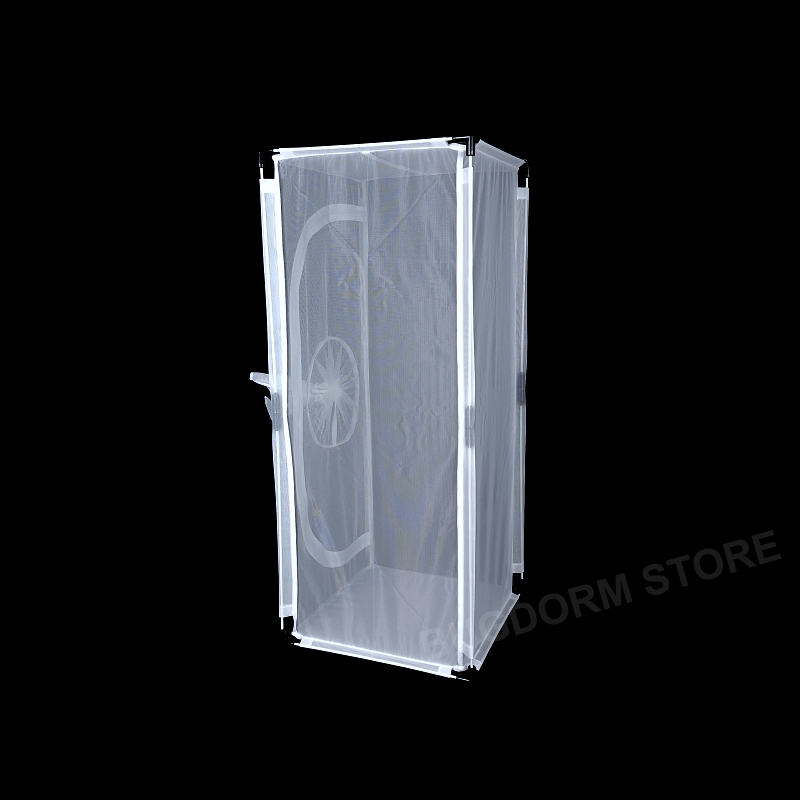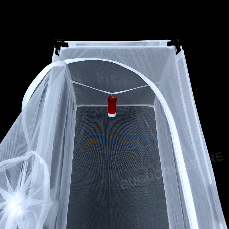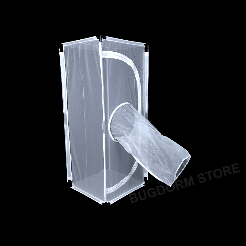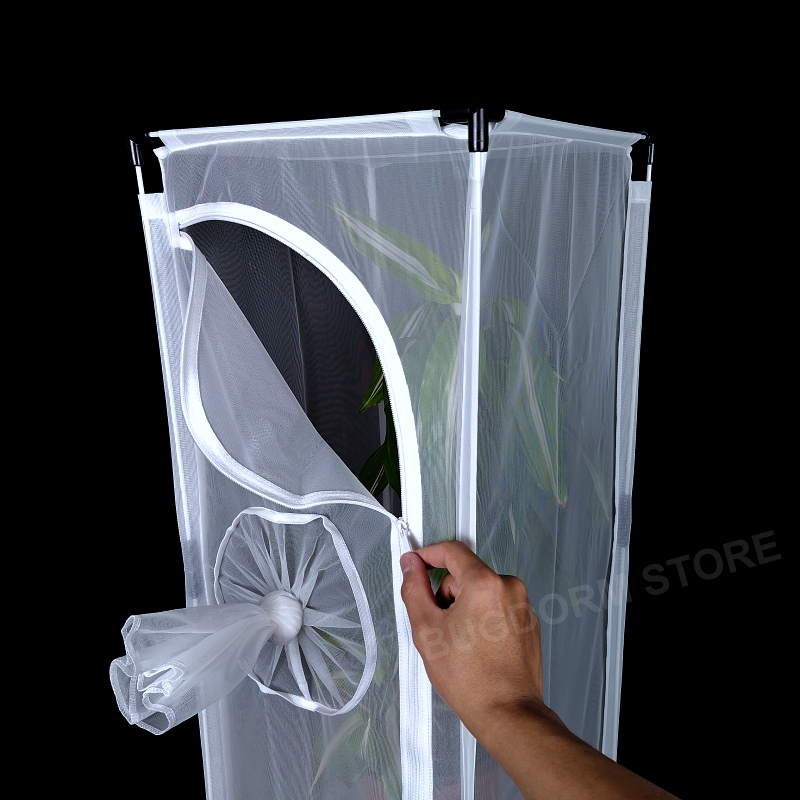 There are two openings in the front panel of the BugDorm-4E3074 insect-rearing cage.  The zippered opening is large enough to insert potted plants.  On the zippered opening is an 18-cm sleeve opening for adding or removing insects and replacing food without letting insects escape.  A thin strip is sewn across the ceiling from which to suspend objects such as feeders.