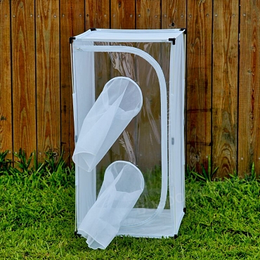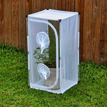 The front panel of the BugDorm-4S4590 insect-rearing cage has three openings.  The zippered opening is large enough to insert potted plants.  Two 18-cm sleeve openings on the zippered opening permit the addition or removal of insects and the replacement of food without letting insects escape.