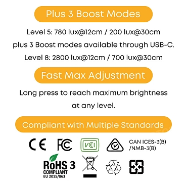 [Four Customizable Color Temperatures / 5+3 Brightness Levels & Turbo Mode]