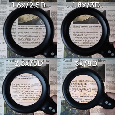 Our LED magnifying glass features a 4-inch (100mm) white biconvex lens, ensuring exceptional light transmission.  It produces sharp, crystal-clear images with vibrant, true-to-life colors that are entirely distortion-free.  With a magnification strength of 2.3x (5 diopters), it is optimized for a comfortable focal length of 20 cm.