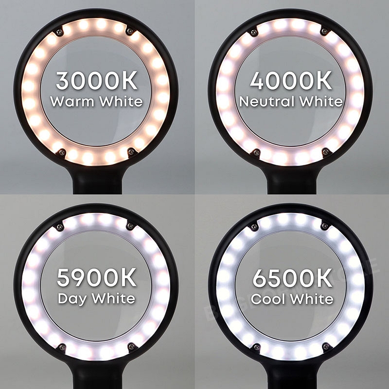 This LED magnifying glass offers 4 adjustable color temperature settings: warm white (3000K), neutral white (4000K), daylight (5900K), and cool white (6500K).  It includes 5 brightness levels when powered by batteries, along with 3 additional boost modes accessible through USB-C.  At a distance of 12 cm, it delivers 780 Lux at brightness level 5 and 2800 Lux at level 8.  For maximum brightness, press and hold the button for four seconds.  Effortlessly switch between 32 different lighting modes with just two quick taps.