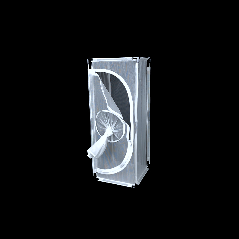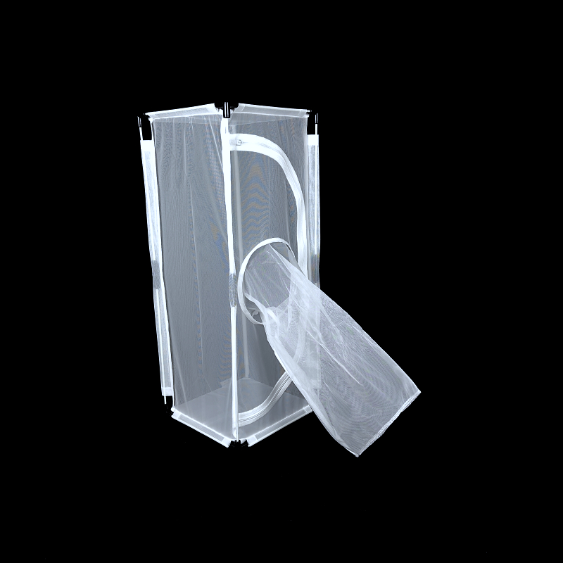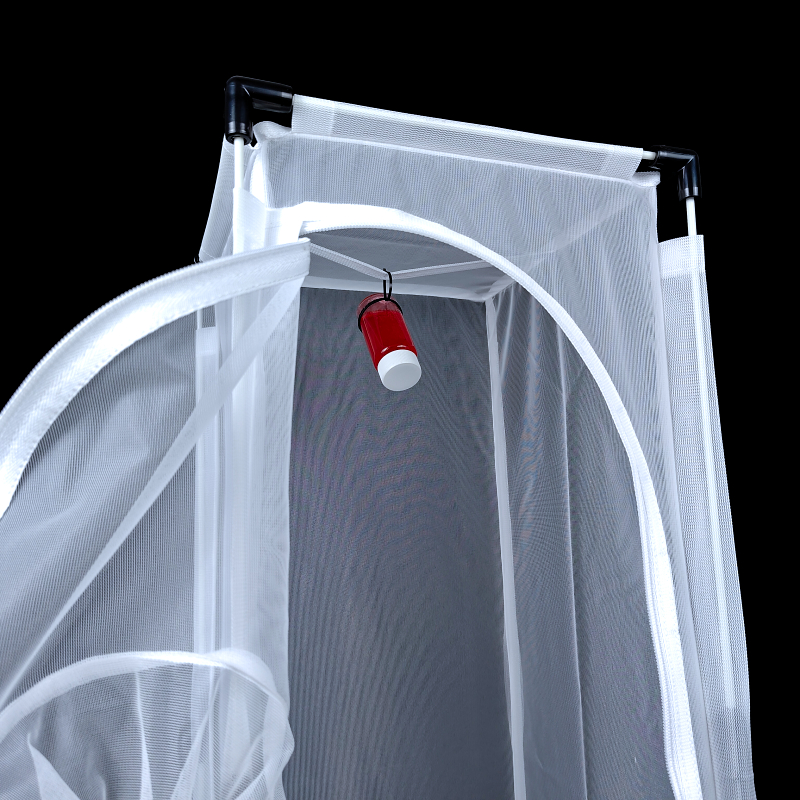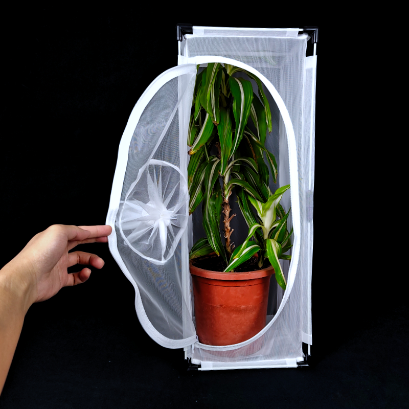 The front panel of the BugDorm-4M2260 insect-rearing cage has two openings. The zippered opening is large enough to insert potted plants. An 18-cm sleeve opening is also on the zippered opening, which allows for adding or removing insects and replacing food without letting insects escape.