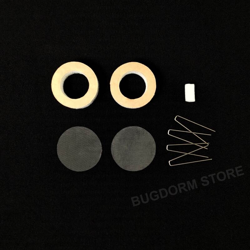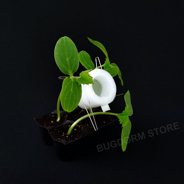Each package has 12 clip cages, including x24 form pieces, x100 mesh circles, and x48 pins.  The foam has an outer diameter of 4 cm, an inner diameter of 2.5 cm, and a height of 1.5 cm.  Half of the foams have small holes (Ø5 mm) and plugs to access the inside of the cage with an insect aspirator.