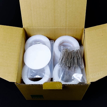 Each package has 12 clip cages, including x24 form pieces, x100 mesh circles, and x48 pins.  The foam has an outer diameter of 6 cm, an inner diameter of 4 cm, and a height of 1.5 cm.