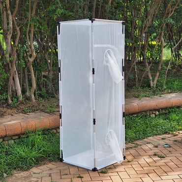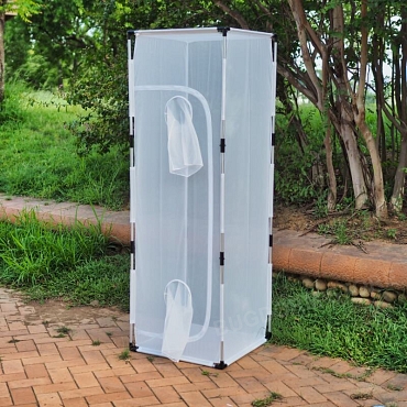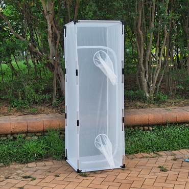 180-cm tall, BugDorm-6M630 insect cage is suitable for large potted plants.  All panels except the floor are of Nylon netting (44 x 32 mesh) for ventilation.  A thin strip is sewn across the ceiling from which to suspend objects such as feeders.